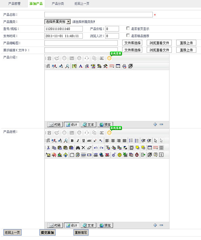 12.在“產品內容”字段,可以在線編輯您產品詳細內頁的內容