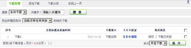 3.在“在下載列表”,設(shè)置下載的SEO配置(詳細【3.4.1】章節(jié)進行介紹)、修改、是否開啟下載,刪除等操作。
