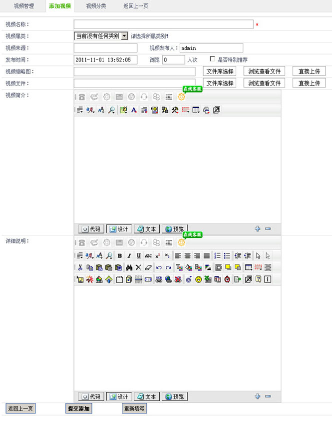 8.在“視頻文件”字段,可以選擇直接上傳和文庫選擇,添加您視頻文件。