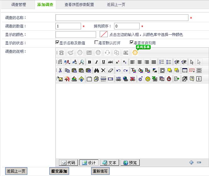 1.在“調查的名稱”字段,填寫調查的名稱名稱。2.在“調查的數值”字段,填寫調查的名稱數值。3.在“顯示的顏色”字段,填寫顯示調查的顏色值。4.在“顯示的狀態”字段,設置顯示的狀態(顯示名稱及數值、是否默認打開、是否開啟引用)。5.在“調查的說明”字段,填寫在線調查詳細說明。