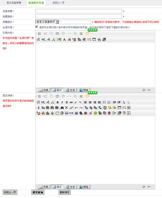1.在“信息標題”字段,填寫圖文的標題名稱2.在“標題簡稱”字段,填寫圖文的標題簡稱。3.在“同屬圖文”字段,填寫顯示同屬圖文。( 確定標識(字母或與數字、下劃線組合等組成)后將不可以修改)4.在“全局引用”字段,設置(選中表示可引用到所有頁面,如不選中則可不填寫下面的引用內容)。5.在“引用內容”字段,填寫圖文需全局引用內容。6.在“圖文詳細”字段,填寫圖文信息詳細內容。