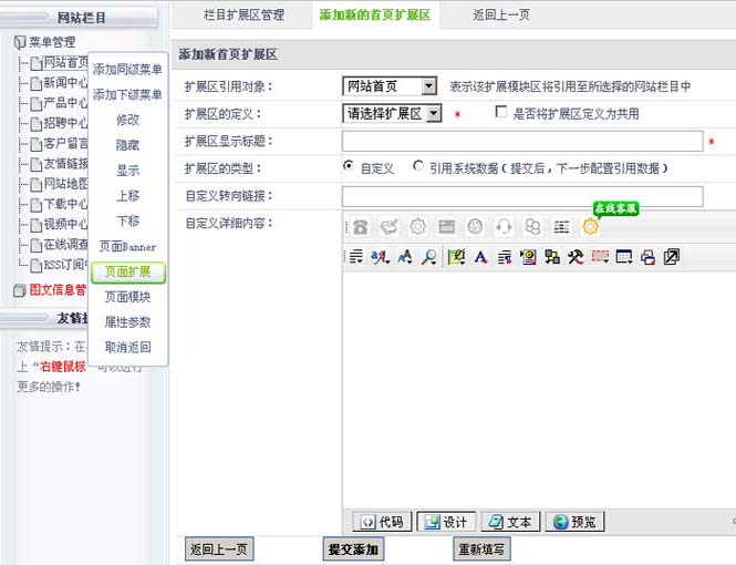 左則菜單管理>鼠標(biāo)右鍵>頁面擴(kuò)展>添加新的擴(kuò)展區(qū),如下圖;