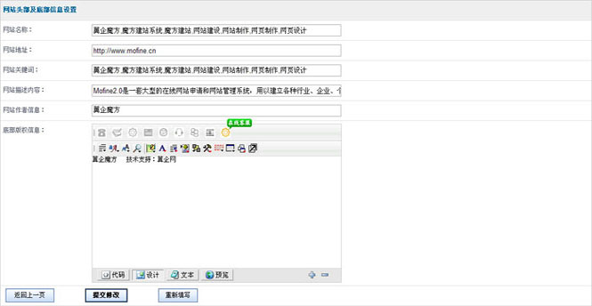 5.在“底部版權信息”字段,輸入網站的名稱,版權開發日期等。