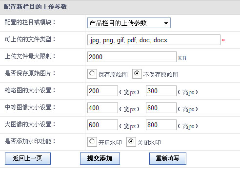 點擊“配置新欄目的上傳參數” 可以添加新的欄目上傳參數(如下圖): 可以設置不同等級的圖片大小,包括縮略圖大小。